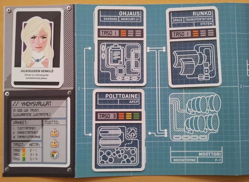 Player board with a character card (Celebrity), a faction card (USA) and three out of the required four rocket improvement. Provided by Renni Honkanen via BoardGameGeek.